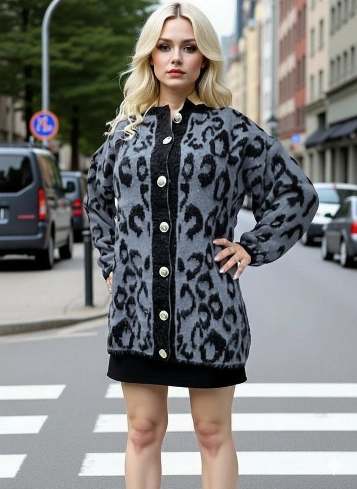 38-60 beden aralığı Gri renkli, leopar desenli, kürk detaylı kısa uzun kollu kadın hırka. Salaş kesim ve bisiklet yaka ile günlük kullanım için uygundur.