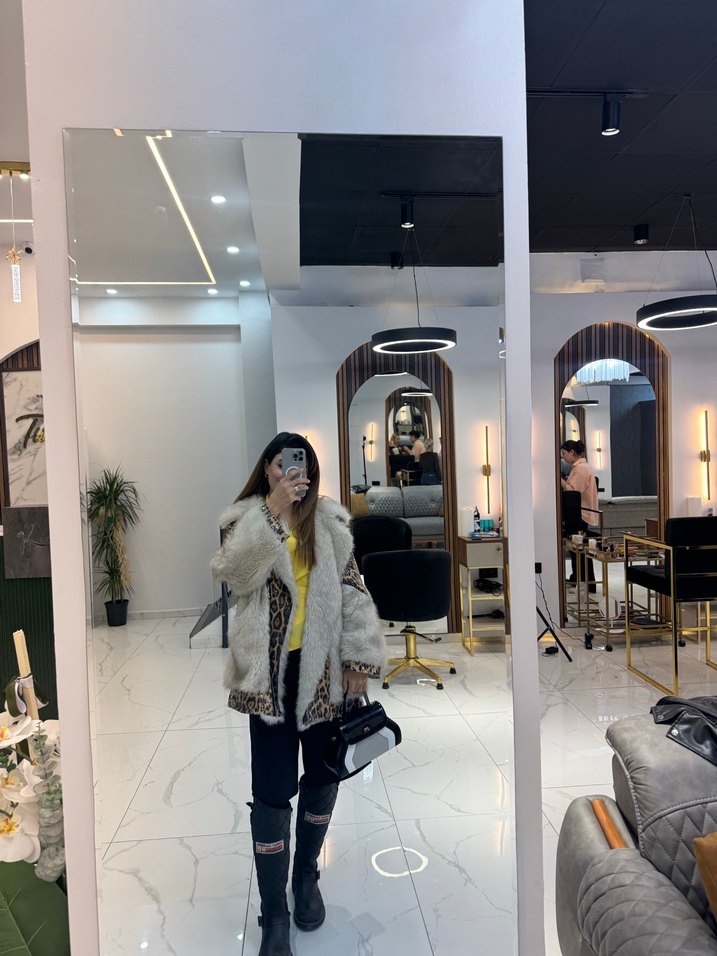 Leopar desenli, gri midi boy, yüksek yakalı suni kürk. Uzun kollu, bol kesim ve kürk detaylı, günlük kullanıma uygun sıcak tutan dış giyim.