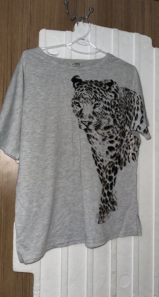 Gri renkte, kısa kollu ve yuvarlak yakalı bol kesim htişörtü. Leopar desen baskılı ve sentetik kumaştan üretilmiştir. Rahat ve günlük kullanıma uygun.