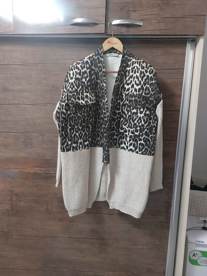 Uzun, örme yapıya sahip bu gri hırkanın üst kısmında cesur leopar deseni bulunur. Bol kesim, uzun kollu ve boğazlıdır. Günlük kullanım için uygundur.