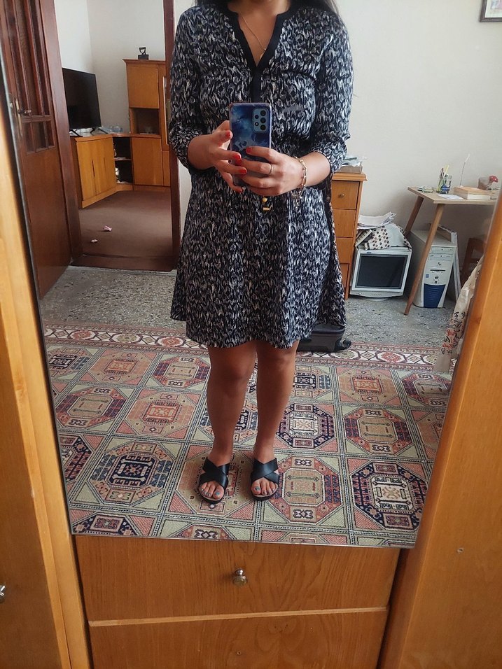 V yakalı gri yılan desenli elbise. Bel kemeri ve rahat kesimi ile günlük kullanıma uygun. 38 beden, sorunsuz harika H&M marka elbise