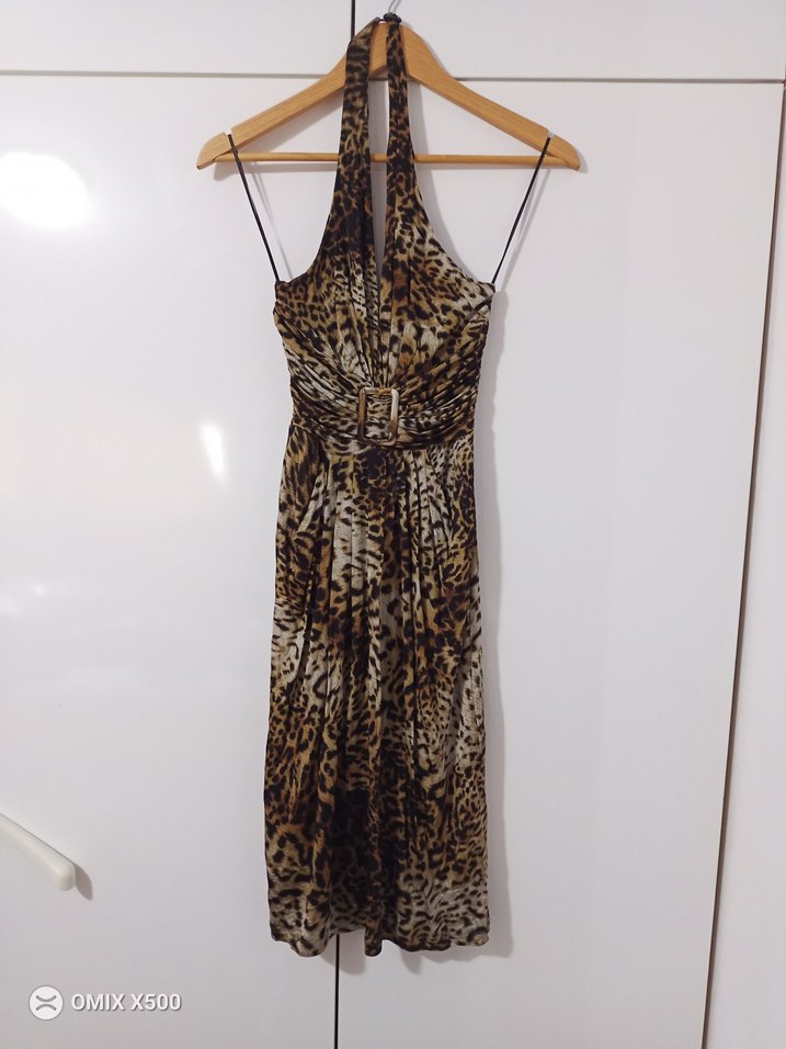 Saten kumaştan,drapeli ve halter yakalı , vücuda oturan kahverengi elbise. Romantik akşamlar için uygun.