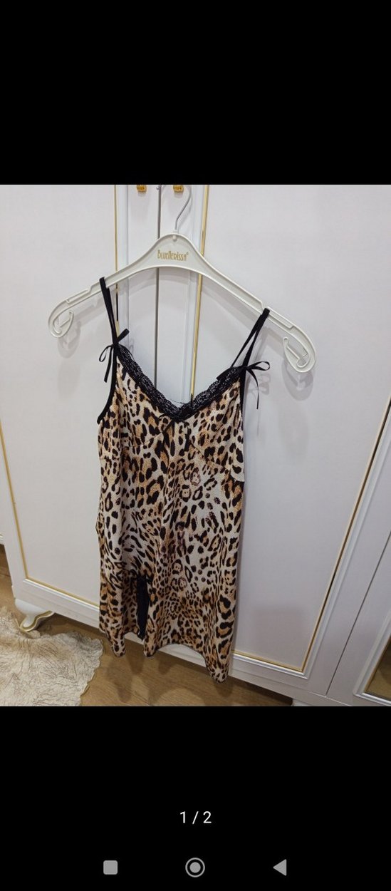 Koyu kahverengi leopar desenli, ince askılı ve dantel detaylı bol kesim mini gecelik. Rahat gece kıyafeti için uygun.