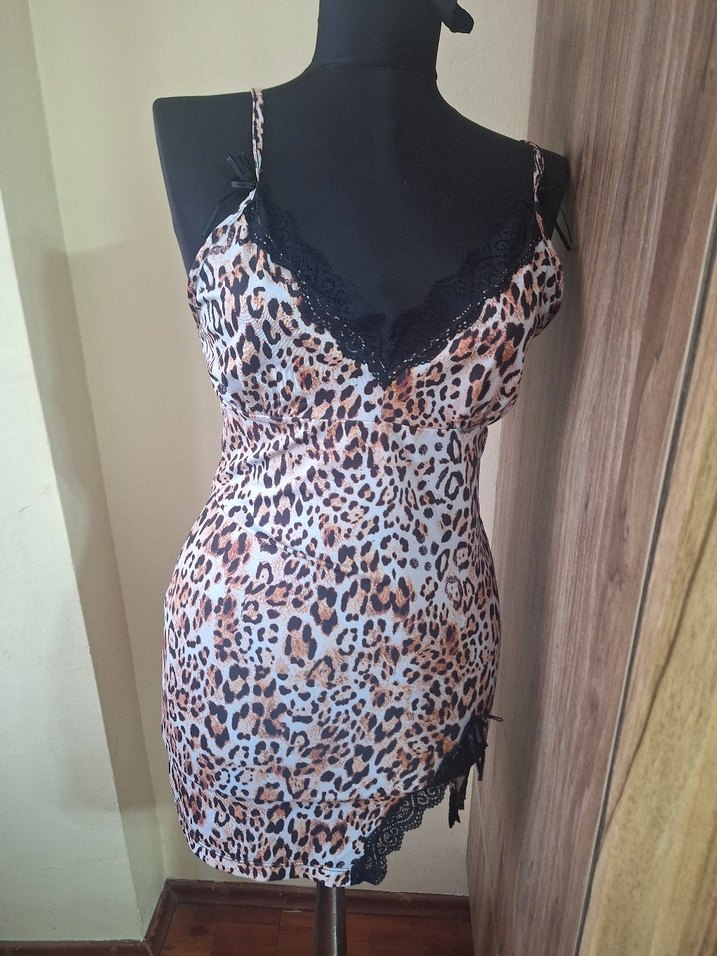İnce askılı, V yakalı, leopar desenli ve dantel detaylı, kısa ve vücuda oturan kahverengi hamile geceliği.