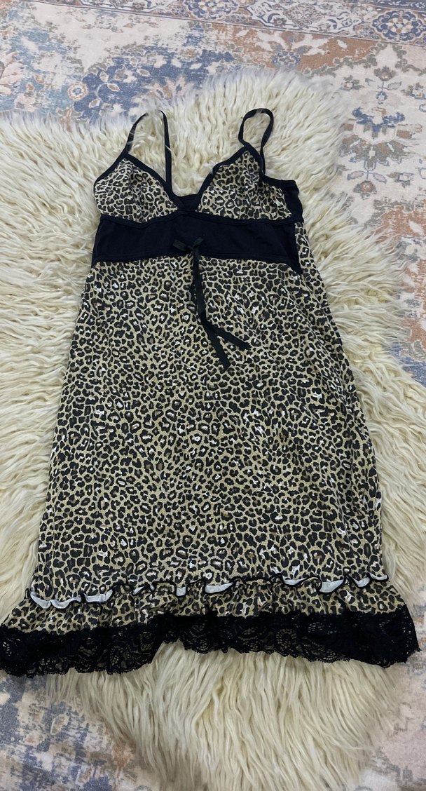 İnce askılı, uzun kesim, kahverengi leopar desenli, beli siyah bantlı ve dantel detaylı, rahat kesim kadın gecelik.