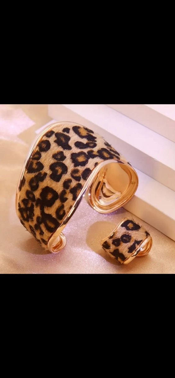 Parlak altın renkli, leopar desenli ve kürk detaylı kelepçe bileklik ve yüzük seti, çağdaş ve bohem tarzı bir araya getirir.