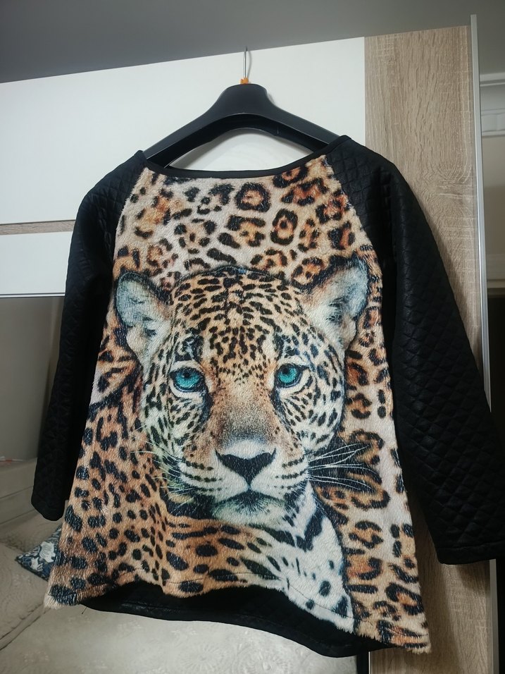 Siyah uzun kollu, sentetik kumaş, leopar desenli ve ön yüzünde büyük leopar yüzü ile tüylü detaylı bol kesim kadın bluz. Günlük ve sokak stiline uygun.