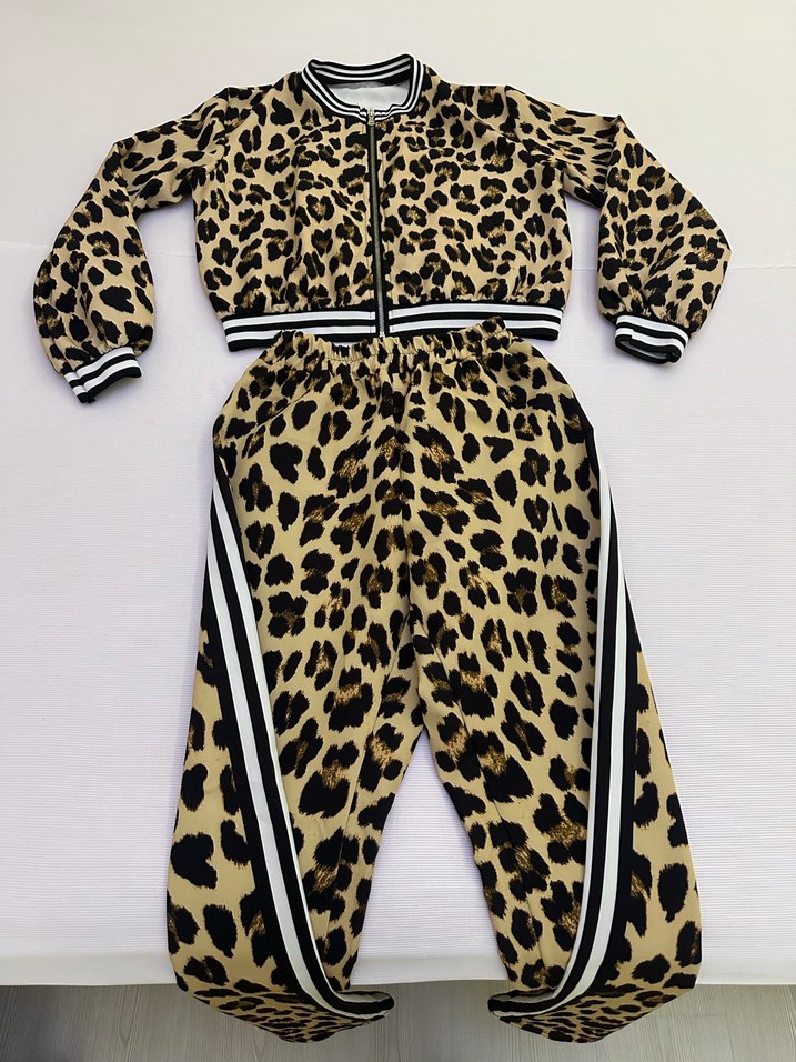 Kahverengi leopar desenli, kürk detaylı kadın eşofman takımı. Uzun kollu, bisiklet yaka ve fit kesim ile dış mekan kullanımına uygun. M ve l bedene göre