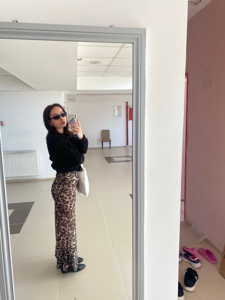 Kahverengi leopar desenli, kadın etek. Günlük kullanıma uygun rahat ve şık bir tasarım.