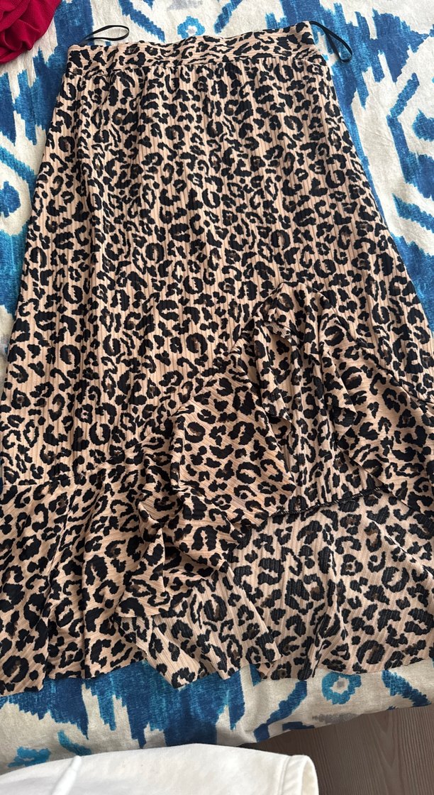 Kahverengi leopar desenli, bol kesim yırtmaçlı fırfırlı etek yumuşak sentetik kumaştan ve fırfır detaylı, açık hava kullanımı için uygundur. 71/72 cm boyu yırtmacı 35 cm denk geliyor