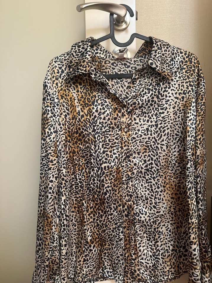 Leopar desenli, parlak kahverengi renkte, yakalı ve düğmeli, bol kesim kadın gömleği, yumuşak sentetik kumaştan.