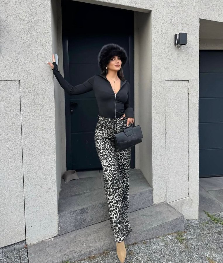 Kadınlar için regular fit, uzun boy, cesur leopar desenli ispanyol paça pantolon. Sentetik kumaştan, kürk detaylı, günlük sokak stili için uygun. 800as