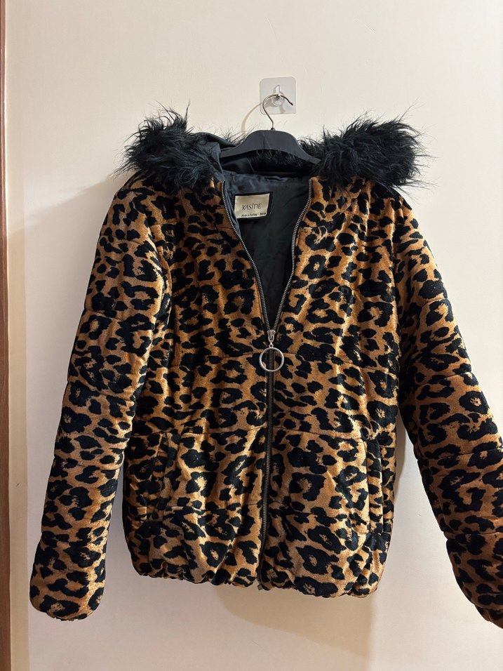 Leopar desenli, kürklü kapüşonlu, uzun kollu, yakalı, rahat kesim kadın kadife şişme mont Yumuşak ve sıcak kumaştan üretilmiştir.