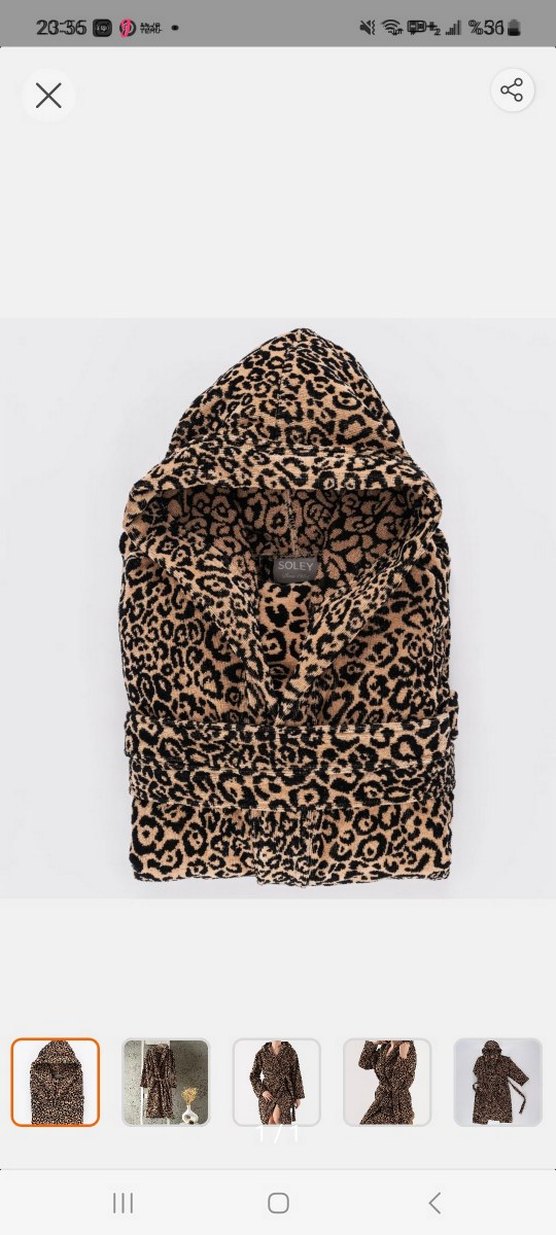 Leopar desenli koyu kahverengi kadın bornoz, uzun kollu ve bol kesimdir. Midi boyda ve kapüşonludur, rahat sokak stili için uygundur.