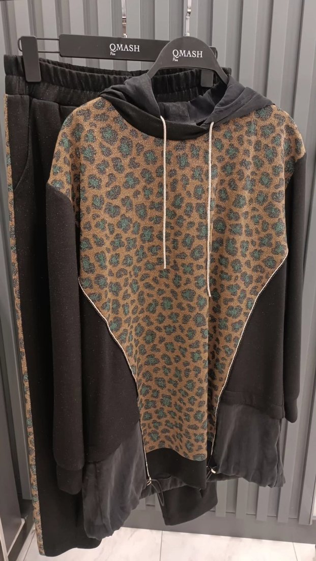 Kadınlar için bol kesim, uzun kollu, yuvarlak yaka, leopar desenli ve fermuarlı eşofman takımı. Yumuşak sentetik kumaştan, koyu kahverengi, günlük kullanım ve sokak modasına uygun. 40 ila 48 bedene kadar olur tek kaldı