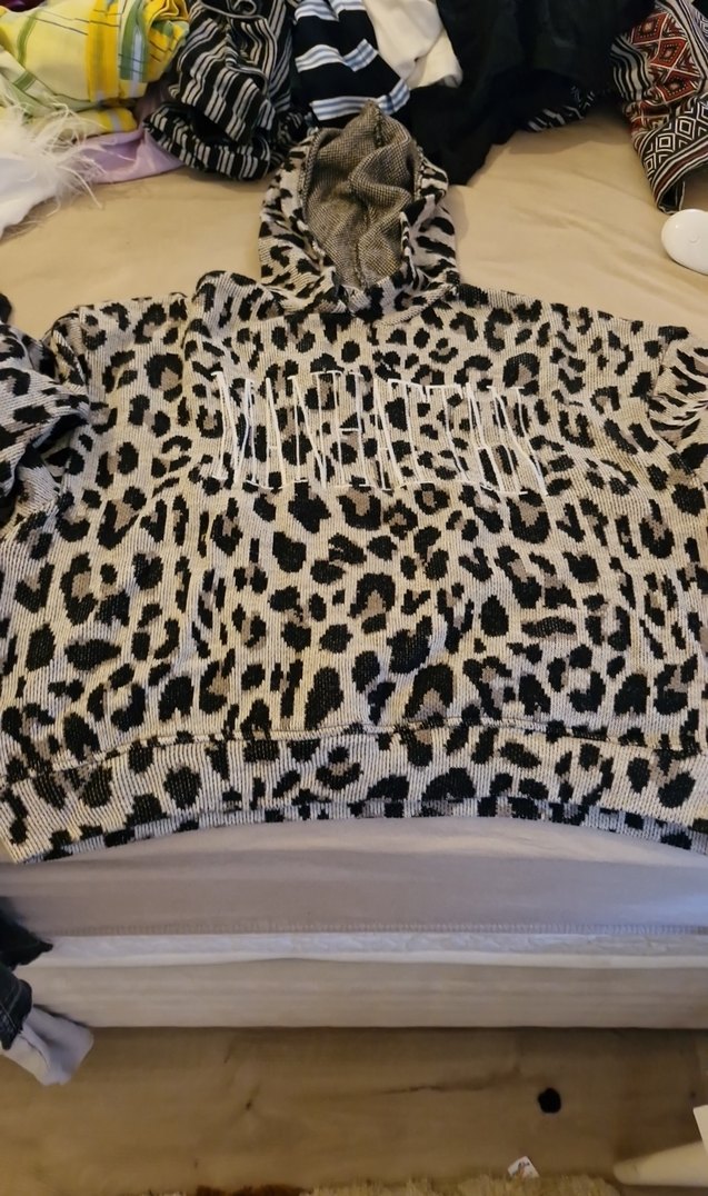 Kadınlar için leopar desenli, kapüşonlu ve uzun kollu bol kesim sweatshirt. Yumuşak sentetik kumaştan, kürk detaylıdır. Rahat ve günlük kullanıma uygundur.