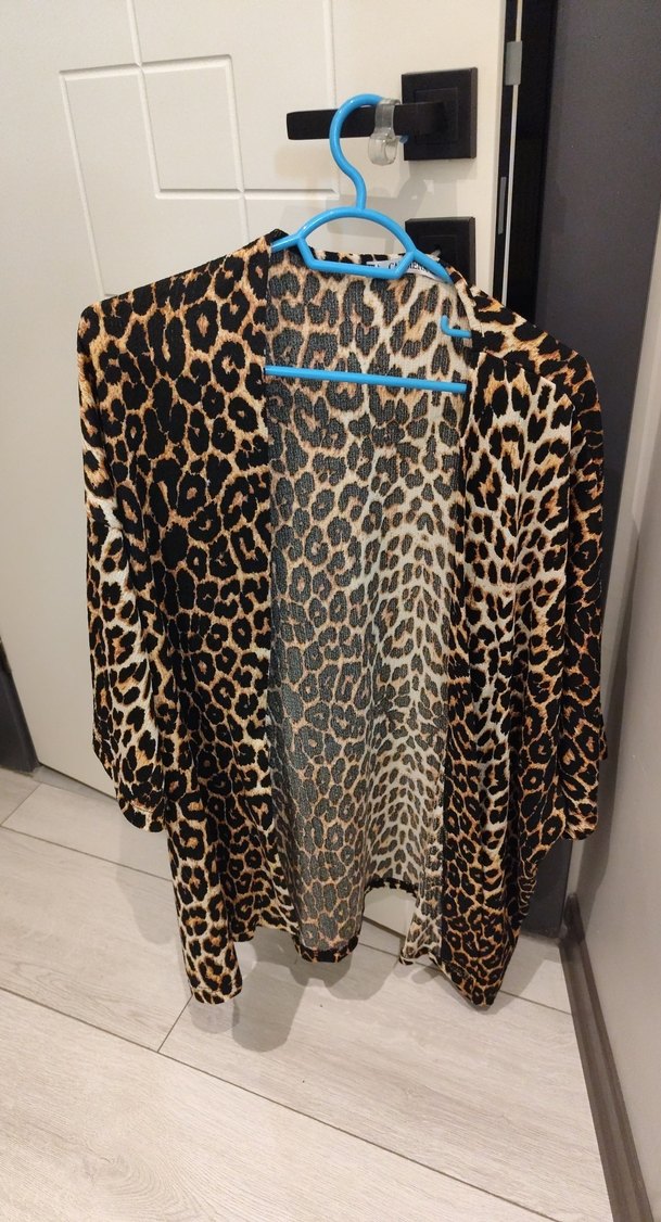 Leopar desenli, uzun kollu, V yaka kadın kimono. Sentetik kumaş ve kürk detaylı, salaş kesim, günlük kullanım için uygundur.
