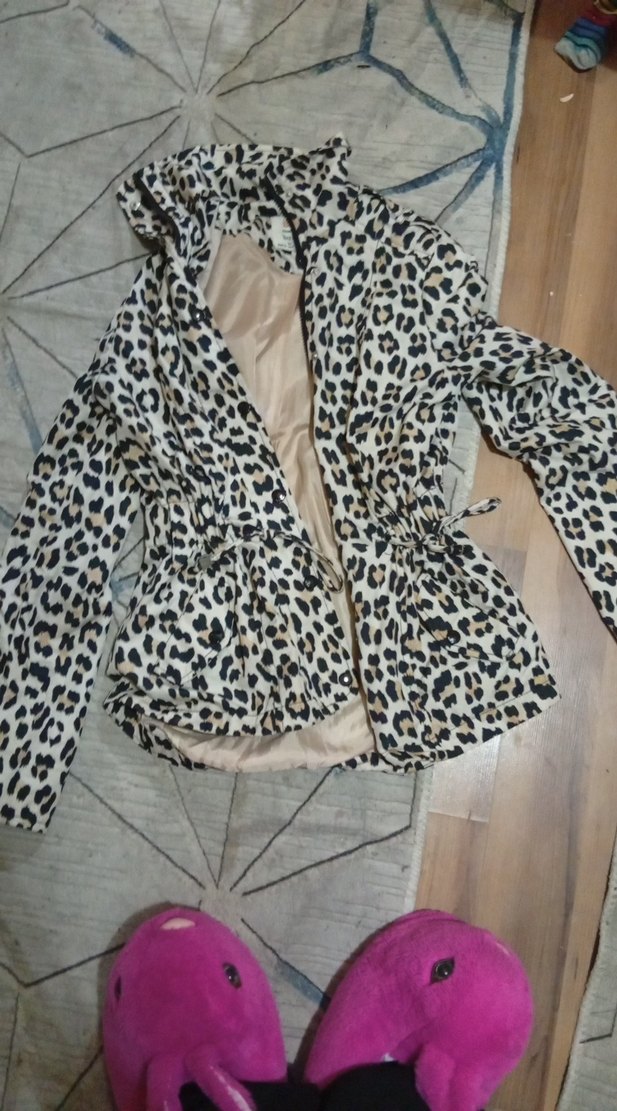 Leopar desenli, kısa kesim, bol kesim kadın ceket. Uzun kollu, çentikli yaka ve kürk detaylıdır. Sentetik kumaştan, rahat ve trend sokak stili sunar.