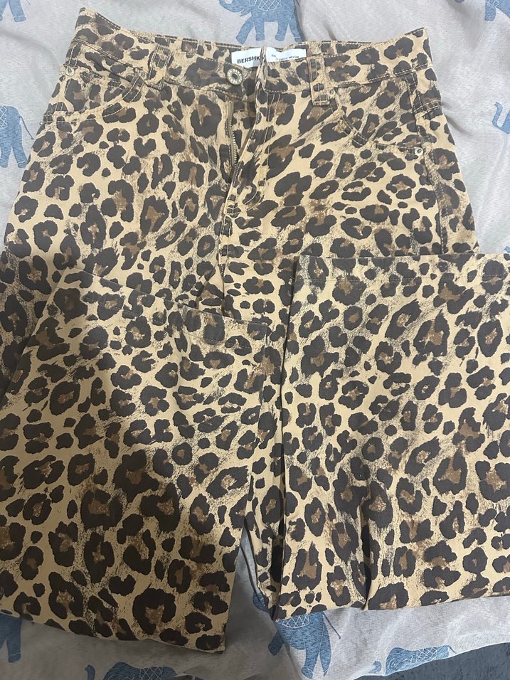 Düğmeli, kahverengi leopar desenli, sentetik kumaştan yapılmış bol kesim midi pantolon. Sokak stili ve dış mekan kullanımı için uygundur.
