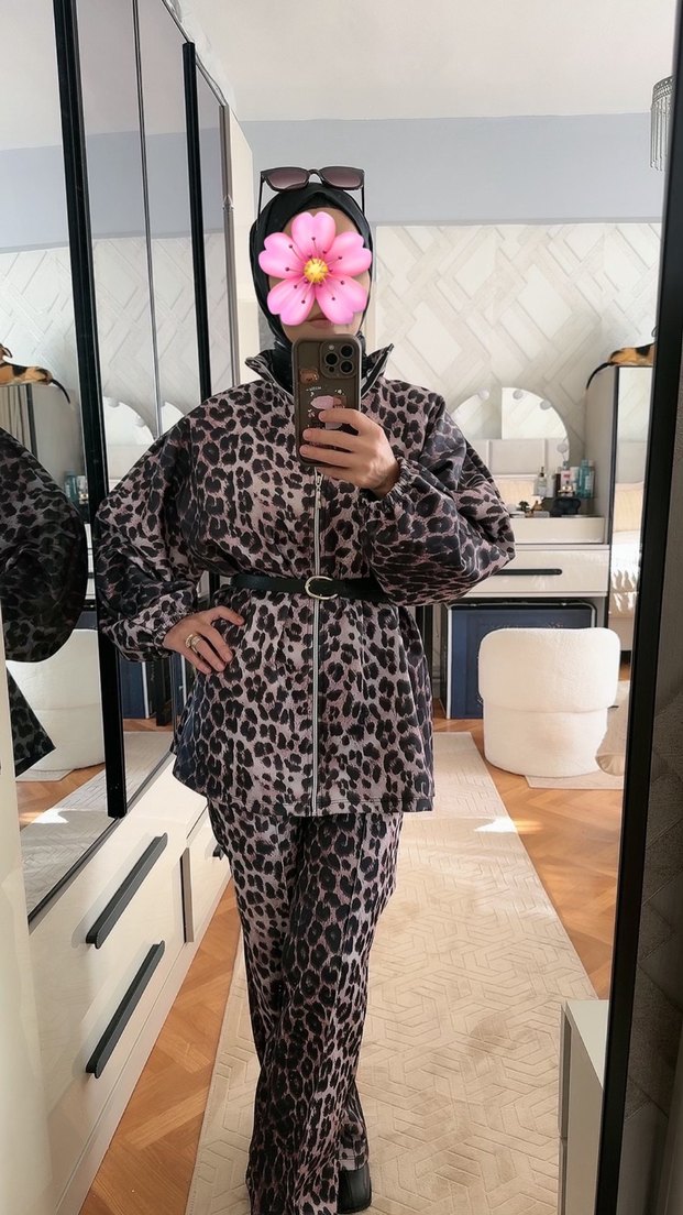 Kadınlar için leopar desenli midi yağmurluk, bol kesim, yüksek yakalı ve uzun kolludur. Kemer detaylı, koyu kahverengi ve günlük kullanım için uygundur. ️
