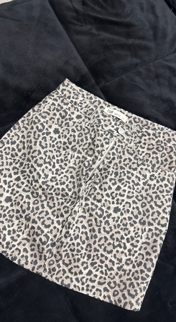 Gri leopar desenli, sentetik kumaştan yapılmış, kürk detaylı, fitted mini etek. Rahat ve şık sokak stili için uygundur.