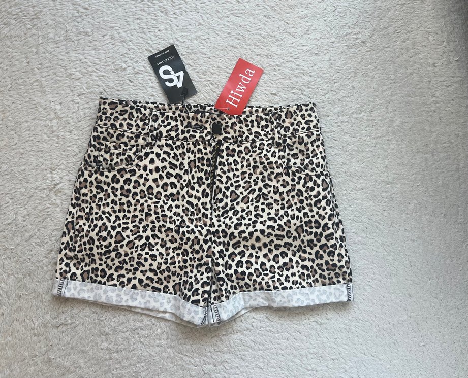 Leopar desenli, kot fermuarlı ve kadın mini şort. Kahverengi ve gri tonlarında, rahat dış mekan kullanımı için uygun.