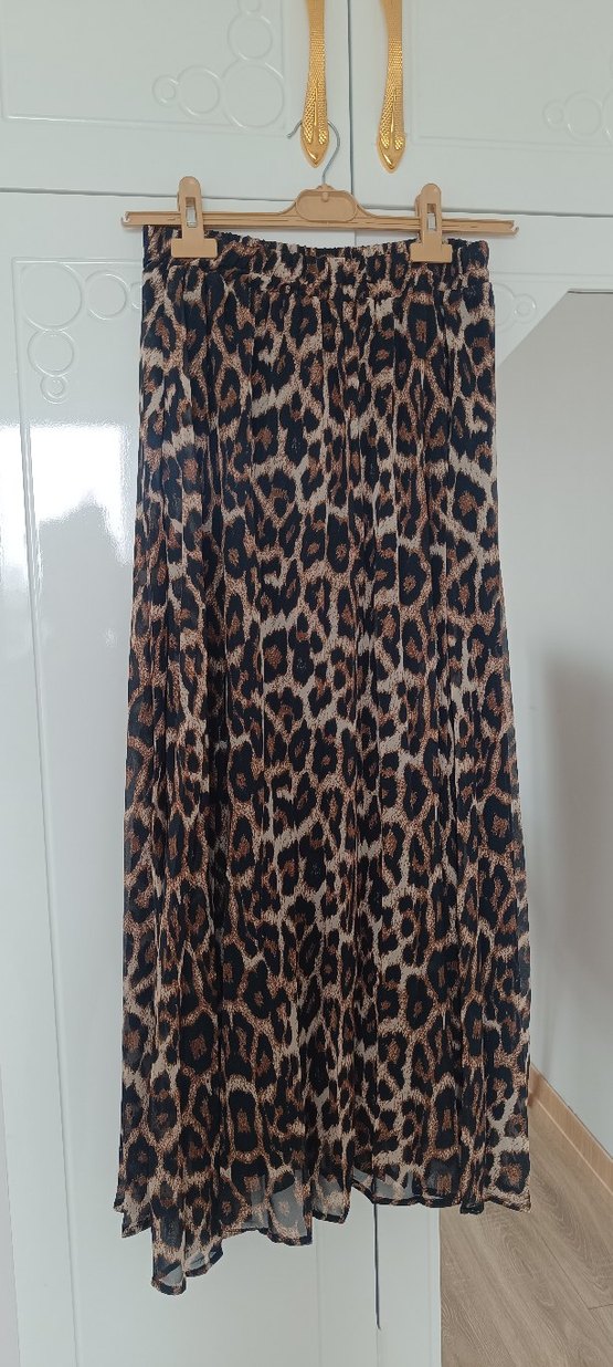 Kadınlar için piliseli ve kahverengi leopar desenli etek. tertemizdir standart bedendir