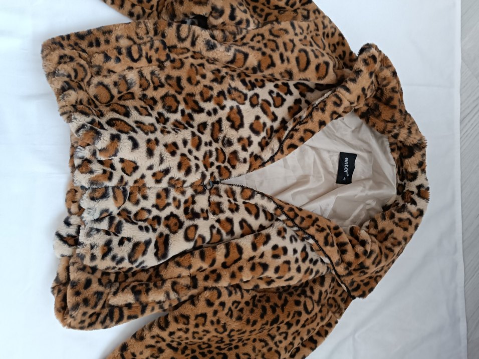 Leopar desenli, suni kürk detaylı, yüksek yakalı ve uzun kollu kadın ceketi. Rahat kesim ve midi boyda, yumuşak sentetik kumaştan üretilmiştir.