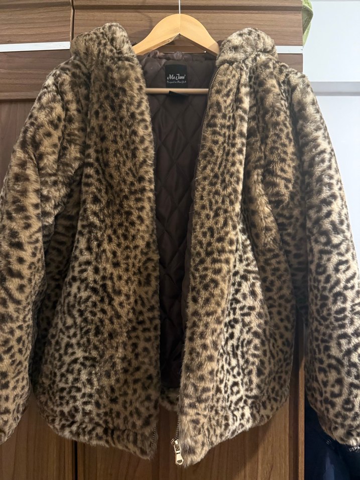 Leopar desenli, uzun kollu, fermuarlı kadın suni kürk ceket. 3-4 kez kullanılmış olup temiz ve defosuzdur.