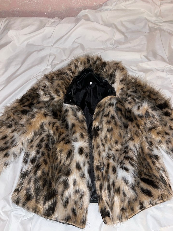 Leopar desenli, suni kürk kadın ceket. Notlu yaka, uzun kollu. Yumuşak sentetik kumaştan, günlük kullanıma uygun. Gerçek kürk değildir, zamanında bir butikten almıştım ✨