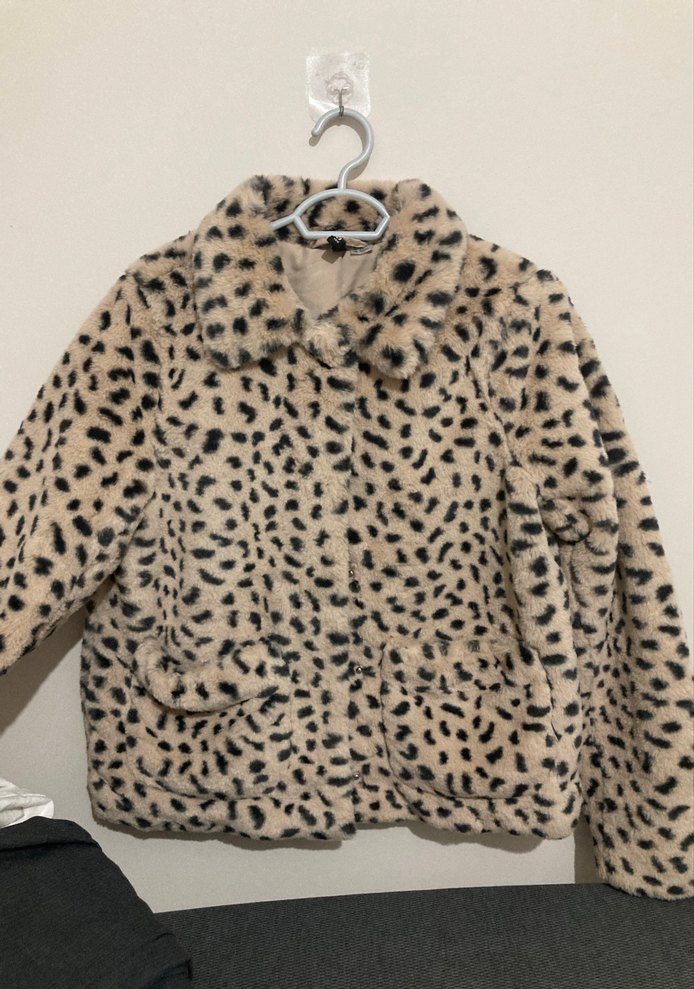 Leopar desenli suni kürk kadın ceket, uzun kollu ve lapel yakalıdır. Yumuşak fleece kumaştan, bol kesim ve midi um boydadır. Günlük kullanım için uygundur. H&M marka tertemiz süper bir ceket