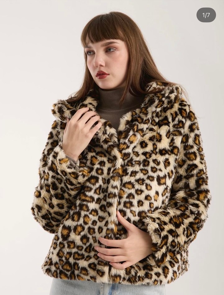 Bol kesim, uzun kollu, leopar desenli suni kürk ceket. Yumuşak sentetik kumaştan, koyu kahverengi tonlarında, günlük kullanım için uygundur.