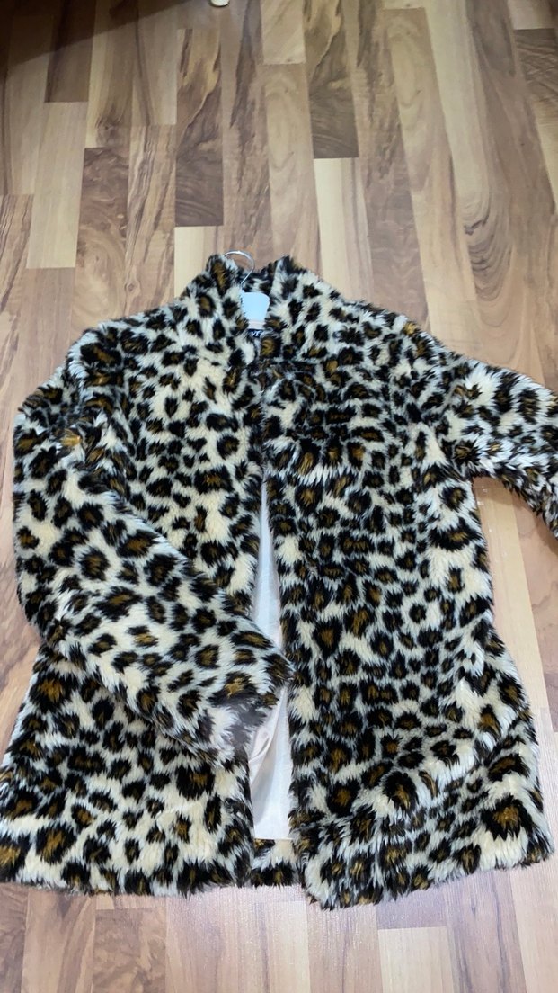 Leopar desenli, uzun kollu, notched lapel yakalı kadın suni kürk ceket. Rahat kesim ve midi boydadır, yumuşak sentetik kumaştan üretilmiştir.