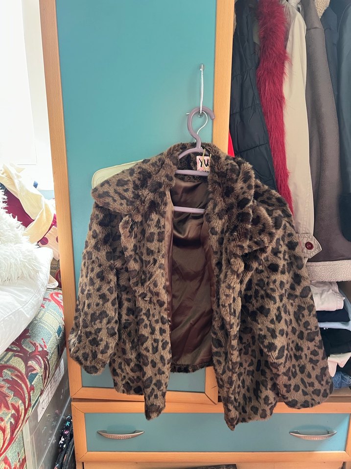 Kahverengi leopar desenli suni kürk kaban, notlu yaka ve uzun kolludur. Bol kesim ve midi boydadır, günlük kullanıma uygundur.