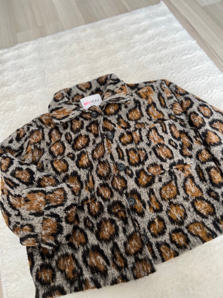 Leopar desenli, yakalı suni kürk midi ceket. Uzun kollu ve bol kesim, yumuşak sentetik kumaştan, rahat ve retro sokak modasına uygun.