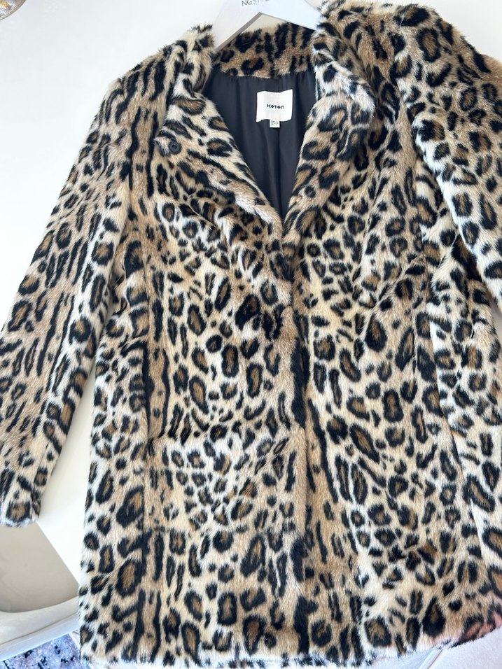 Kadın midi uzunluğunda, suni kürk ve leopar desenli kaban. Notch yakalı, uzun kollu ve bol kesim, rahat ve şık bir görünüm sunar. Koyu kahverengi tonlarında.