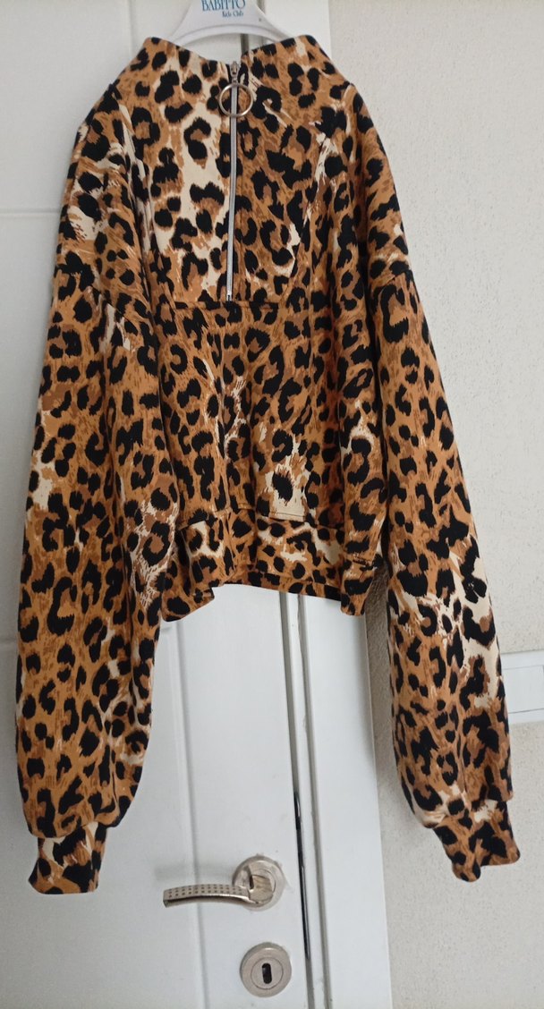 Leopar desenli, bol kesim, uzun kollu ve boğazlı kadın sweatshirtü. Yumuşak sentetik kumaştan, kürk detaylı, günlük kullanıma uygun rahat model.
