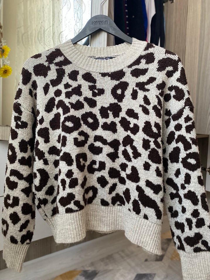 Kadın triko kazak, bol kesim ve uzun kollu. Yumuşak örme kumaştan,kahverengi leopar deseniyle günlük rahat stil için uygun.