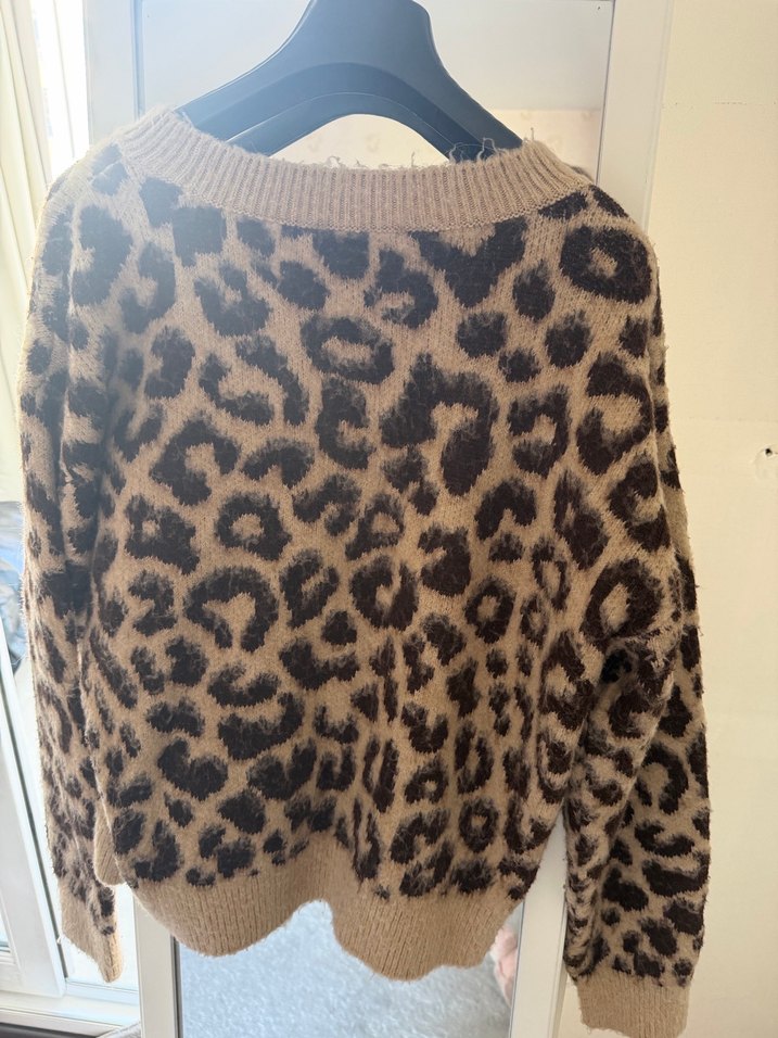 Leopar desenli, kahverengi, uzun kollu, yuvarlak yakalı, bol kesim triko kazak. Rahat ve şık, günlük sokak stili için uygun.