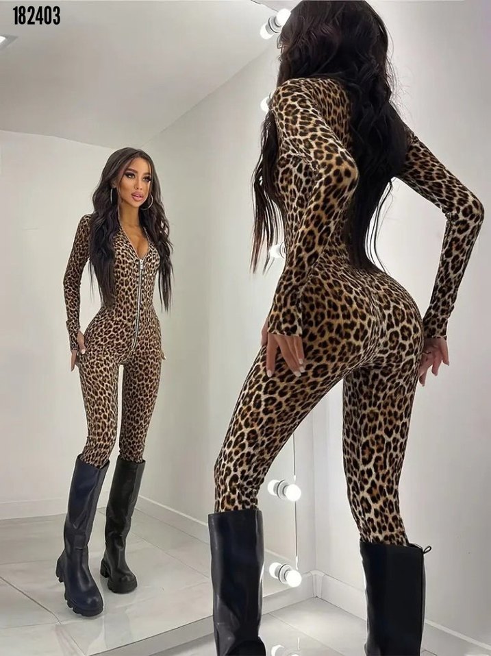 Ürün kodu: 182403 ❤Kadın uzun kollu önden fermuarlı parmaktan geçmeli leopar desenli dalgıç tulum Beden: S-M/L-XL/2XL-3XL Kumaş: DALGIÇ