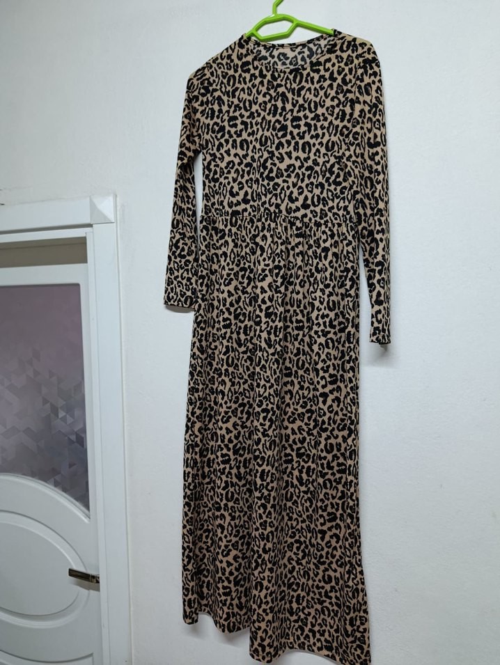Etiketi yok M beden. Leopar desenli, uzun kollu, bol kesim kahverengi elbise. Sentetik kumaştan, pileli ve günlük sokak stiline uygun bir modeldir.