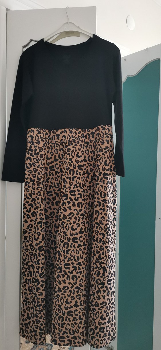 Kadınlar için uzun, bol kesim, yuvarlak yaka ve uzun kollu elbise. Üstü koyu renk, eteği leopar desenli, günlük elbise