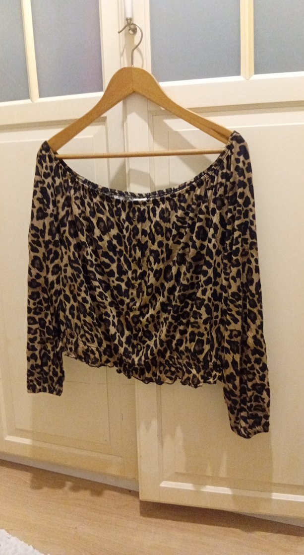 Leopar desenli kadın bluz tekne yaka,drapeli tasarım.Yeni gibidir 42/44/46 bedenler için uygundur