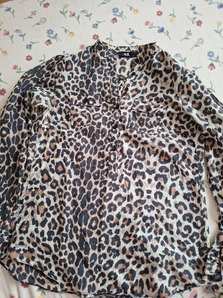Leopar desenli, düğmeli, uzun kollu kadın gömleği. Yakalı, bol kesim ve normal boyda. Yumusak kumaştan, günlük sokak stili için uygun. Adil osik marka, S beden gayet hoş bor gomlek, yaz kış giyilir.