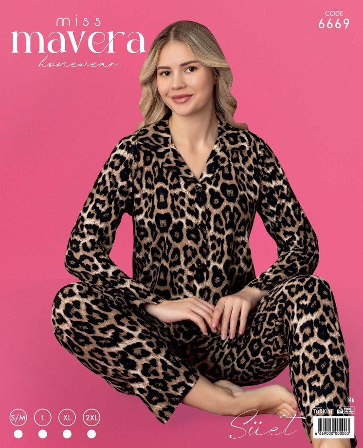 Leopar Desenli Kadın Uzun Kollu Pijama Takımı Süet