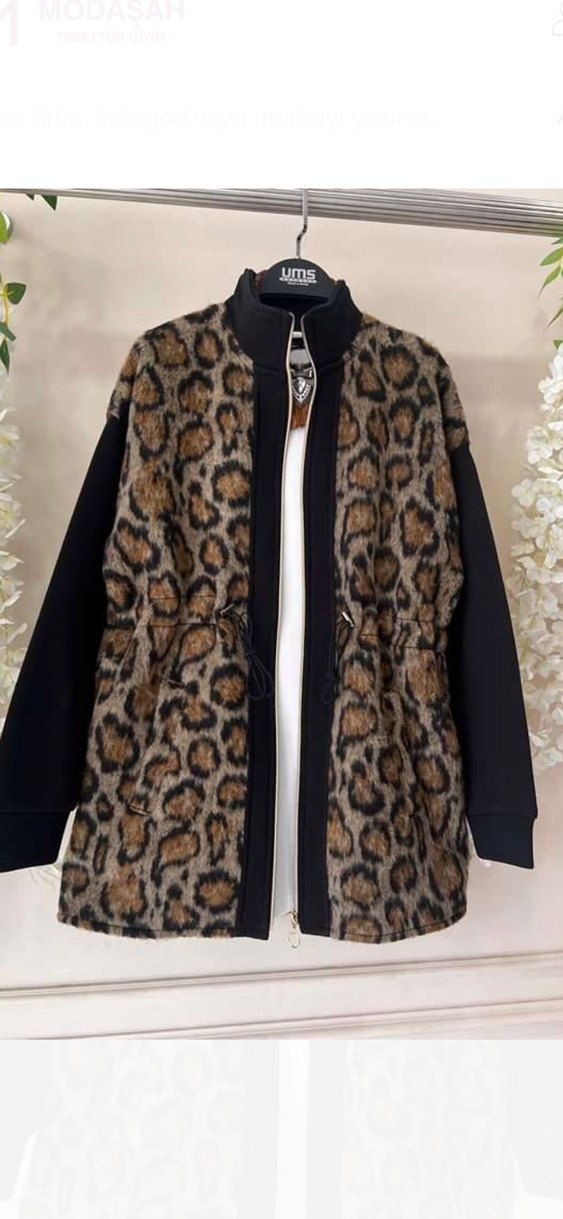 Kadınlar için leopar desenli, uzun kollu, yüksek yakalı ve bol kesim mont. Kahverengi tüy detaylı, yumuşak ve sıcak kumaştan üretilmiştir.