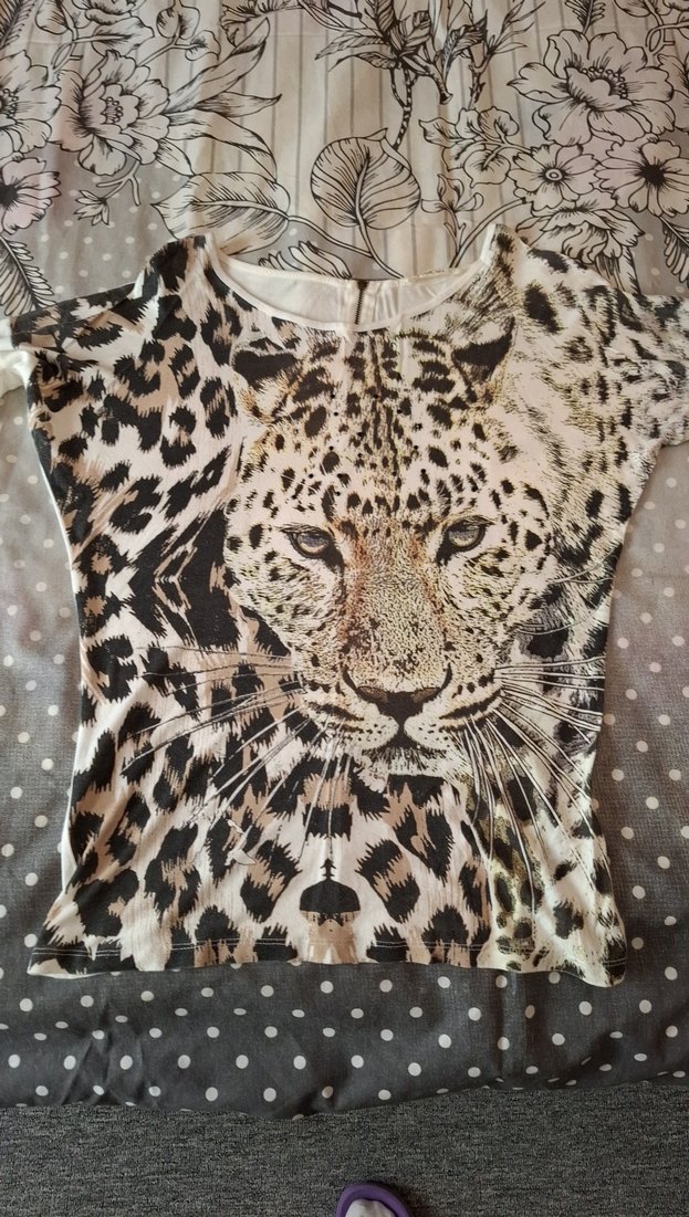 Leopar desenli,yarım kollu ve yuvarlak yakalı kadın bluzu. Sentetik kumaştan, kahverengi ve krem tonlarında, dar kesim.