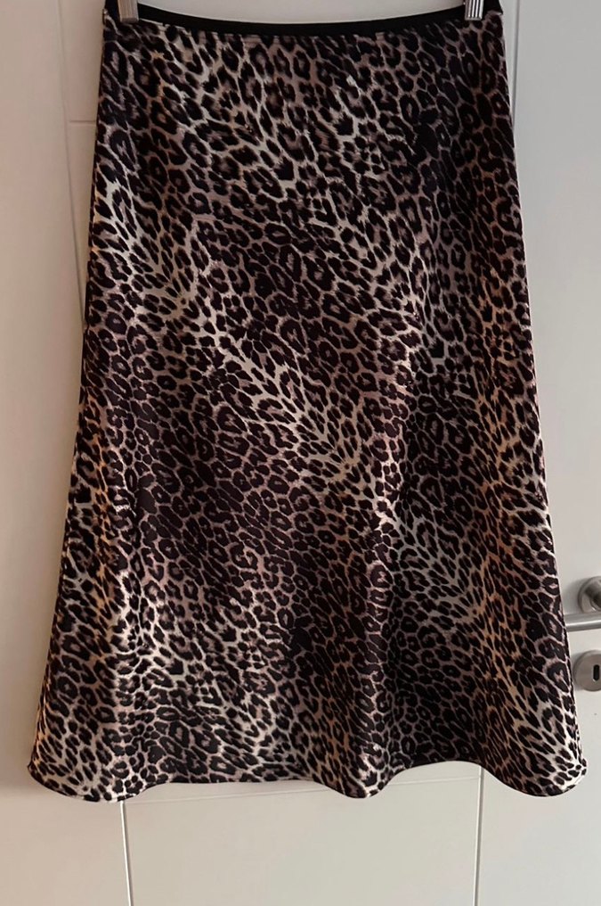 Kahverengi, parlak leopar desenli etek A kesim . Yumuşak sentetik kumaştan, günlük kullanıma uygun şık tasarım.88cm boy