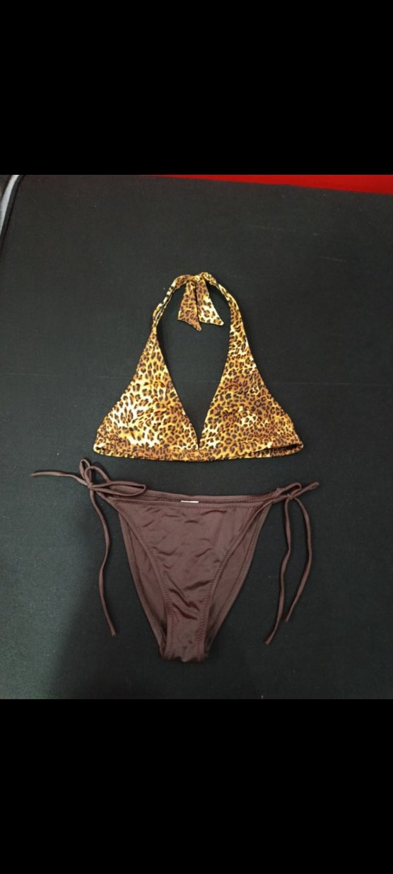 Kadınlar için leopar desenli, bağcıklı üst ve kahverengi alt parçadan oluşan, sıkı kesim bikini.Alındı yıkandı sadece giyilmedi.