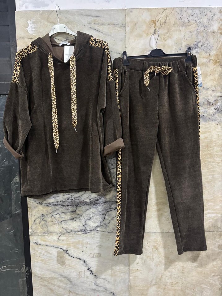Kahverengi İtalyan kadife kumaş leopar desenli detaylara sahip bol kesim uzun kollu kapüşonlu eşofman takımı tesettür için uygundur